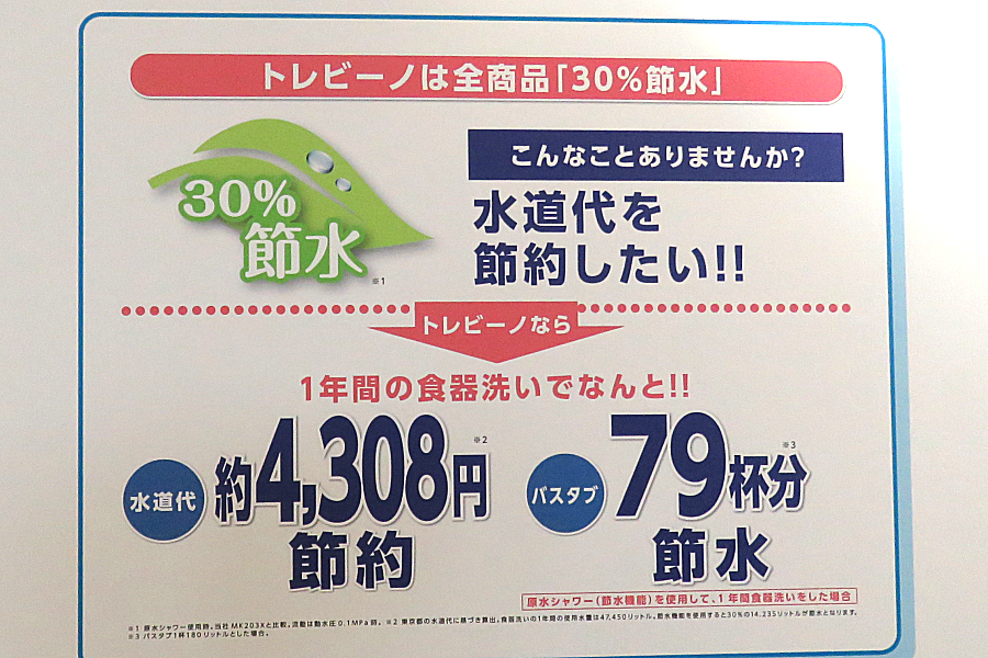 なお、同社では、飲用水としてペットボトルやウオーターサーバーからトレビーノに切り替えることで、経済やエコロジーといった側面からの優位性もアピール。ちなみに、トレビーノの蛇口直結型は全商品「30%節水」を実現しており、例えば、1年間の食器洗いで使用する水道代を普通の水道流水と比較すると、トレビーノを使用すれば4,308円の節約が可能になるいう。