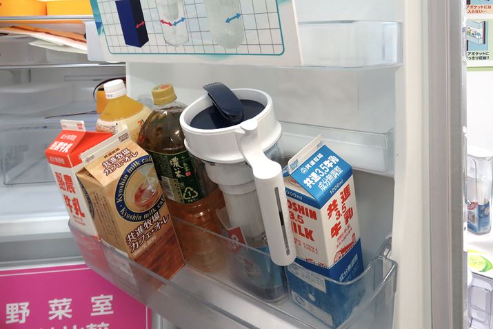 「PT502SV」で冷蔵庫への出し入れのしやすさを実演。取っ手の位置や形状が工夫されていてドアポケットへのおさまりがいい。横置きも可能