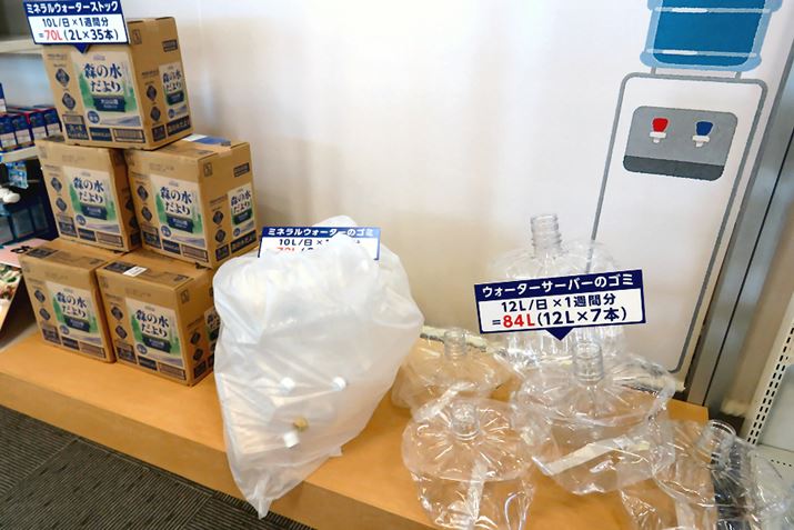 トレビーノとペットボトル、ウオーターサーバーでの1Lあたりのコストの差のほか、ゴミの量の差も強調
