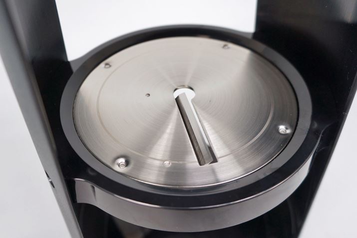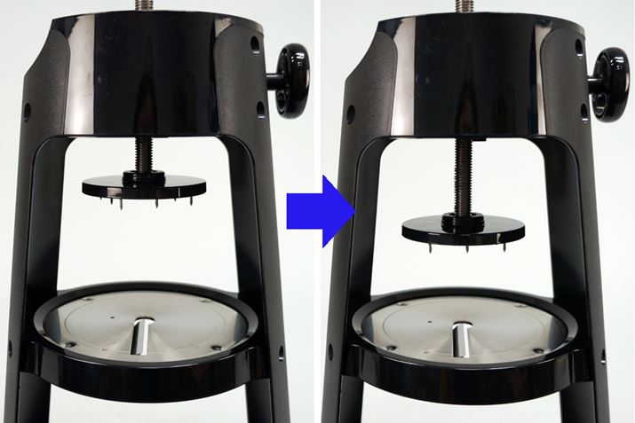 ウォームギアと連動したハンドルを回すと氷を押さえるパーツが下がり、氷にスパイクが食い込みます。このようにすることで氷と刃のムダな隙間がなくなり、その間隔が保持されるので、常に理想的な角度で刃が当てられるというわけですね