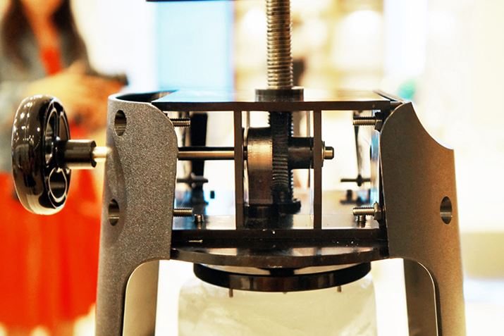 カットモデルを見てみると、氷を回転させるハンドルとつながっているねじ軸に噛み合うような装置があることがわかります。これが、ウォームギア。ウォームギアがあることで、常に一定の圧力で氷をホールドできるのです