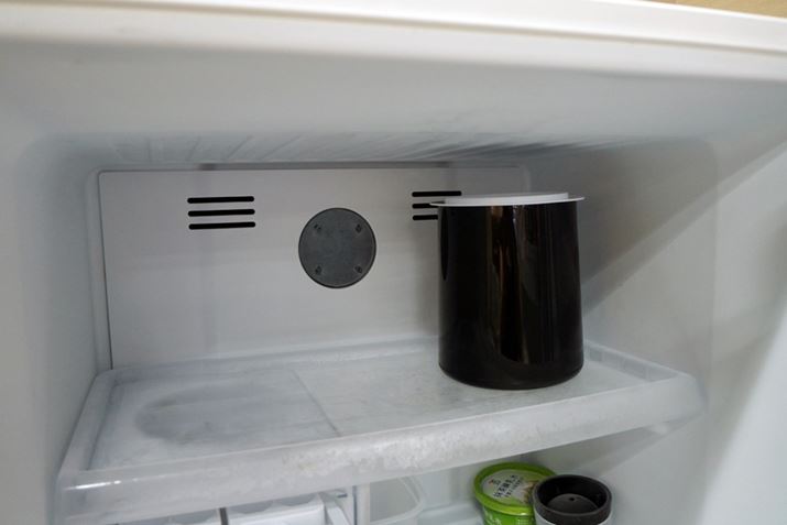 不純物の有無が分かれた氷ができることに半信半疑ながら、ひとまず凍らせてみることに。フタがないので少しニオイ移りが気になります。8時間ほど冷凍庫に入れておけばOK