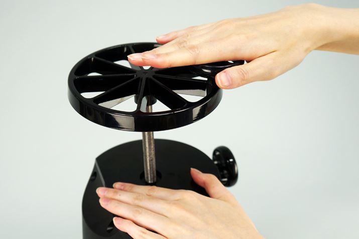 削った氷を受ける皿をセットしたら、氷を削ります。上部のハンドルを、手のひらで上から押さえるようにして回すとやりやすい