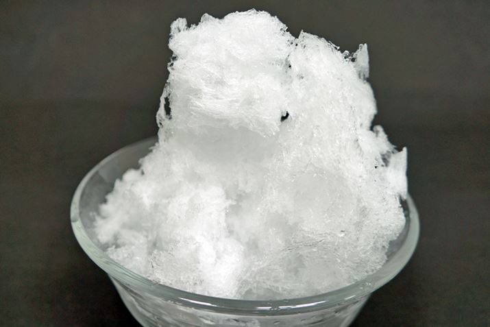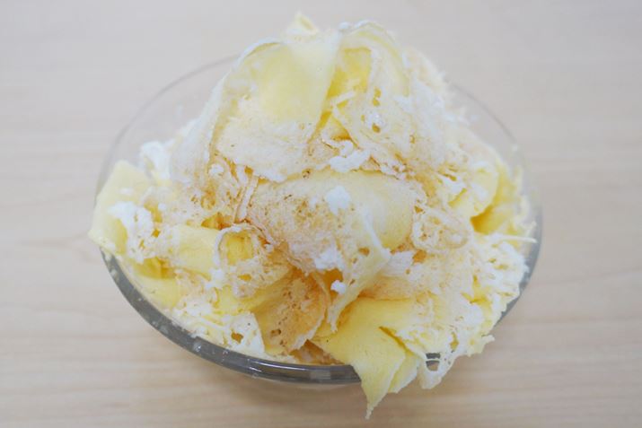カキ氷なのに、削り節のような薄い削れ具合! 空気を含んでいるので、このようにふわっと仕上がるのだといいます。手動タイプ初体験で、この完成度はすごいのでは!?(自画自賛)