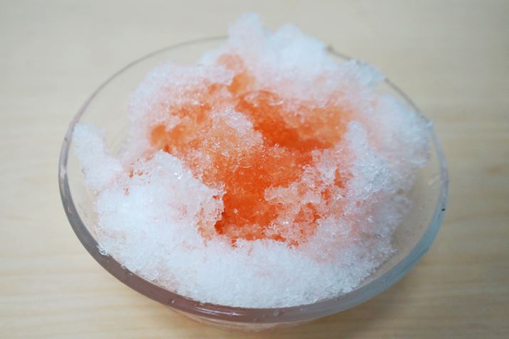 シャーベット状だったためか粒っぽい仕上がりになったものの、ふわふわ感はバッチリ。しかし、冷たいと甘みなどを感じにくくなるようで、ジュースの状態では甘かったのにかき氷では甘みがほとんどない! バニラアイスをトッピングしたらおいしいだろうと思いましたが、ヘルシーや健康と程遠くなってしまいますね。口に含んだ時には感じませんが、食べ終わると素材(ジュース)の風味が口に残ります。甘さ少なめが好みな人は、アリじゃないでしょうか