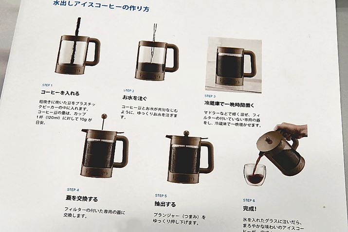 なお、コーヒー豆はフィルターを通らない粗挽きを使用します。量は、カップ1杯(120ml)に対して10gが目安となり、熱湯抽出する場合に比べておよそ1.5倍ほどとのこと。アイスコーヒーで飲む場合、氷を入れることを考えると「BEAN アイスコーヒーメーカー」では、110gのコーヒーでだいたい1.2Lくらいの水で淹れるのがいい塩梅だそう。