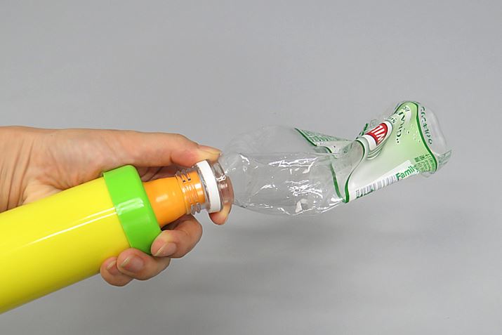 まずは「吸いまっせ!」で水が入っていた350mlペットボトル容器をつぶしてみましょう。そのようすを以下の動画でご確認ください。