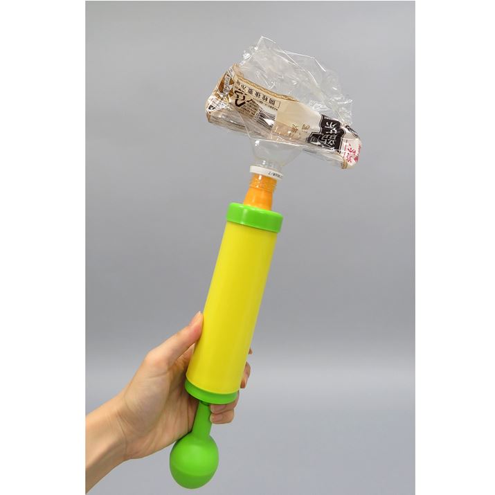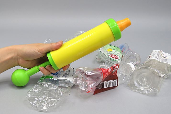 手動のペットボトルつぶし機「吸いまっせ!」。プラスチック製なので軽量です。NHKの番組で紹介されたことから話題になったようです