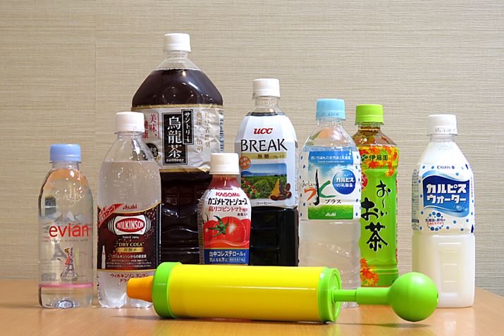 同様に、水だけでなく、炭酸飲料やお茶、ジュース、2Lのペットボトルなど、いろいろなペットボトルつぶしを行ってみましょう。