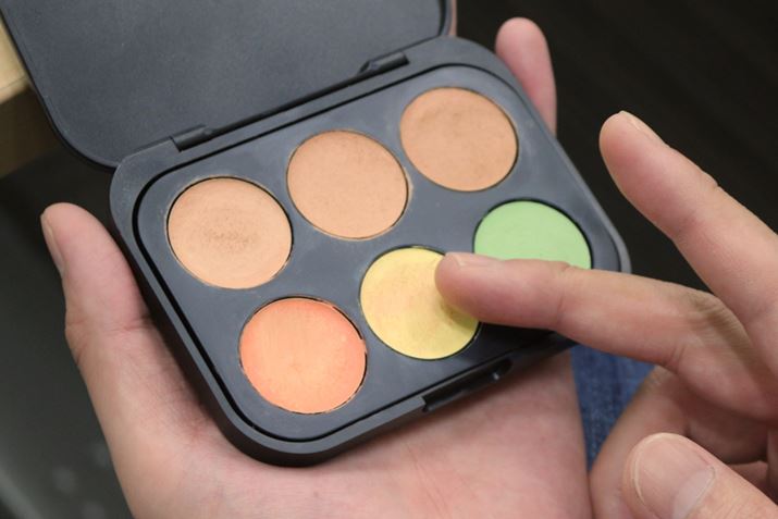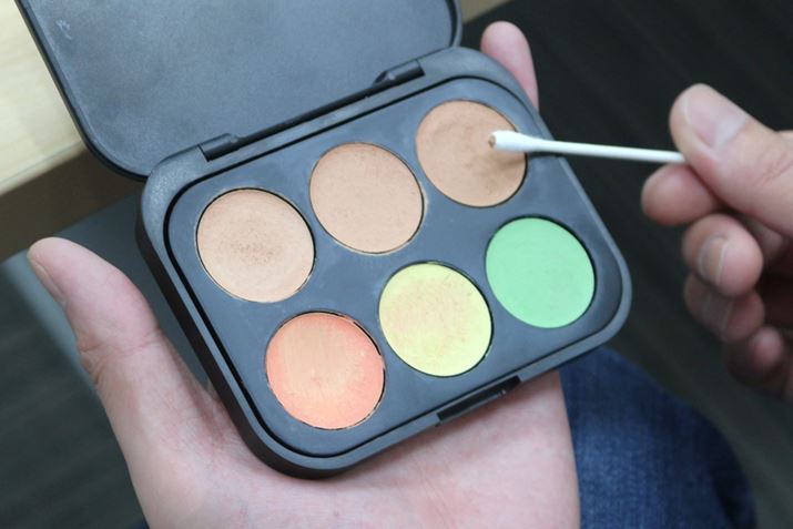 薄い色と濃い色のコンシーラーを手の甲に取り、鏡の前で色味をチェック! 顔に合う色を確認します。必要があれば、色を混ぜて極力顔の色に近い色を作りましょう