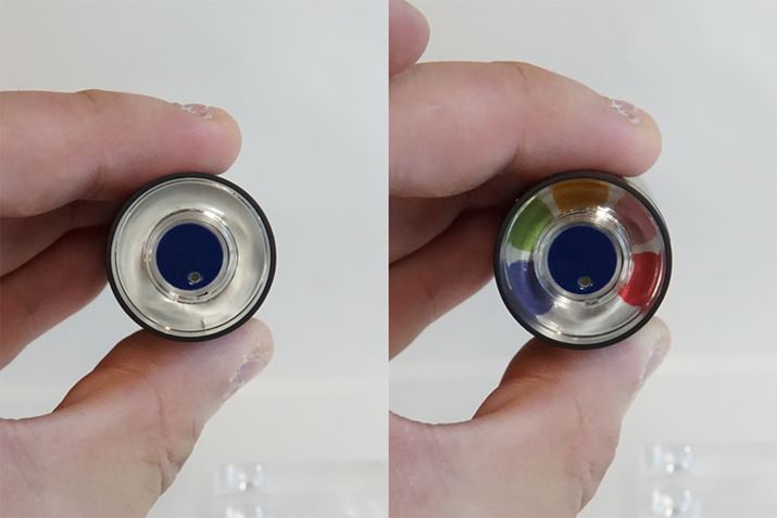 カートリッジ装着部分。カートリッジを挿入すると、内部のミラーに香りのラベルが反射して確認することができる。白い円形のマークをダイヤルで動かし、好みの香りの部分に合わせることで香りを変えられる