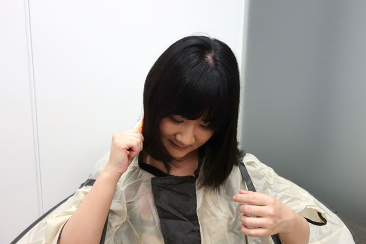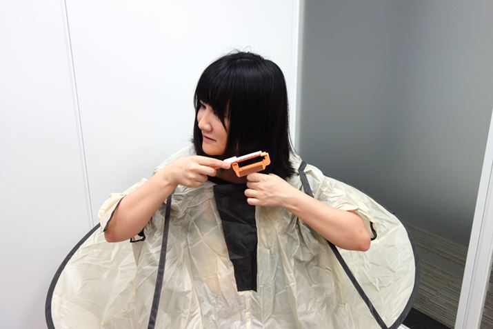 次は、特殊なすきバサミに持ち替えてみた。これはブラシに刃物がくっついているような作りになっていて、これを使って髪をとかすだけで、“すく”ことができるらしい。