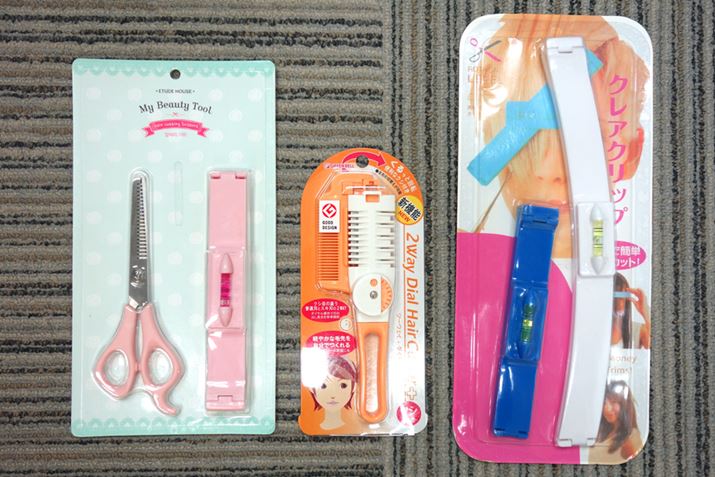 左が「マイビューティーツール ヘアカッティングキット【ハサミ 前髪カット】」(ETUDE HOUS製)、中央が「ツーウェイ・ダイヤルヘアカッター クシ付き オレンジ MB-306」グリーンベル製、右が「クレアクリップ」(コモライフ製)