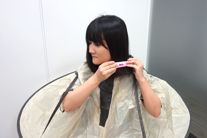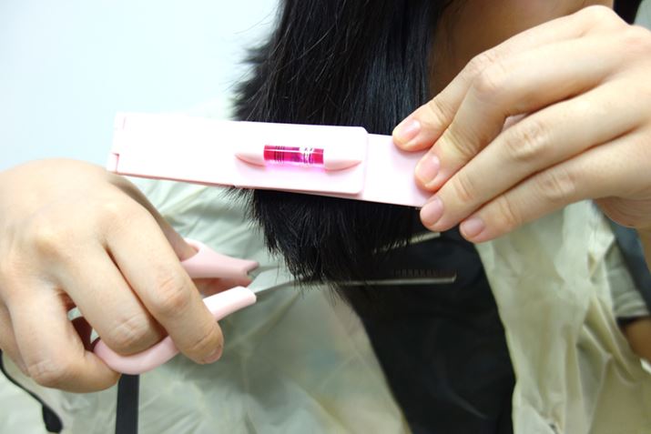 このクリップのような道具で髪の毛を挟み、それに沿ってカットすれば、まっすぐ切れるらしい。しかし、そもそもこの道具を真っ直ぐ装着すること自体が難しいうえに、普段すべての髪を完全にまっすぐ切ってもらっているかというと、おそらくそうではないため、さっそく路頭に迷うことになる。