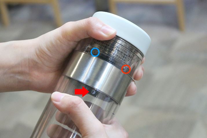 弁の開閉は本体をひねって行います。ツイスティーという名称は、おそらくこの動き(ツイスト)から来ているのでしょう。ボトル部のマーク(矢印)と「●(赤丸)」が重なると「閉」、「○(青丸)」が重なると「開」です。ただ、結構硬くて力が必要なので、指を引っかける部分や滑り止めが欲しいところ