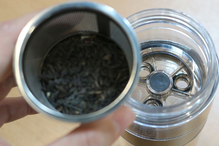 お茶を淹れる際は、弁が開いた状態で本体に茶葉を入れたストレーナーをセットし、フタをします。今回は、リーフタイプの茶葉(アールグレイ)を使用