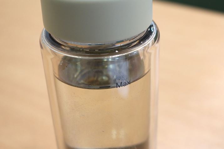 お湯は「MAX」のラインまで。ボトル部分は2重構造になっているので、熱い飲み物を入れた状態で触っても熱くありません