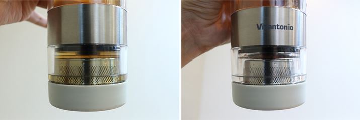 弁を開けた状態(左)と、閉じた状態(右)。弁が開いているとストレーナー部分にお湯が入りますが、閉じていると入ってきません。これによって、お茶の濃さがキープできるのです