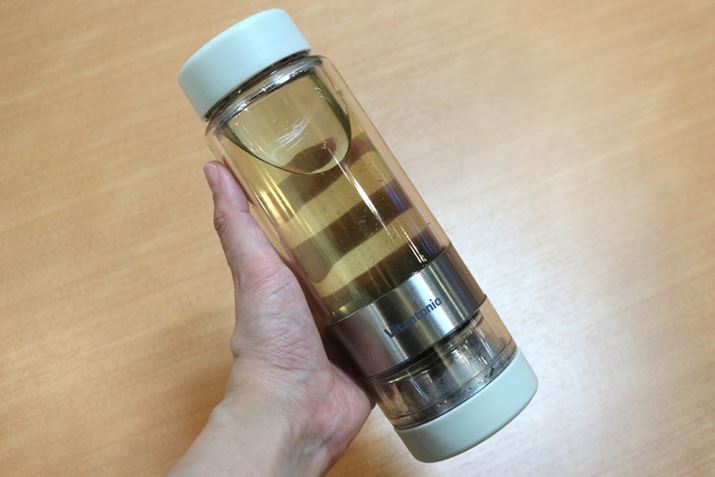 「ツイスティー」は、本体内のストレーナー(茶こし)に茶葉を入れて、そこにお湯や水を注いでお茶を淹れ、そのまま飲めるタイプのタンブラーです。こういったタンブラーは「ツイスティー」以外にもありますが、「ツイスティー」とほかのタンブラーの違いは、ストレーナーとボトルの間に開閉できる弁があること。その弁を閉めることで、お茶の濃さを調整してキープできるのです。価格は2,600円程度(2016年10月末時点)。