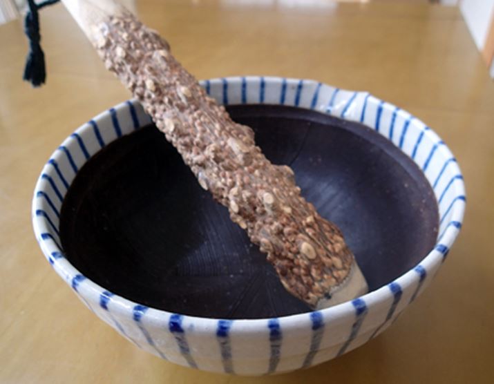 最初はすりこぎの底でごまをトントンと叩いて潰し、次に円を描くように潰します | |