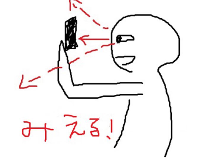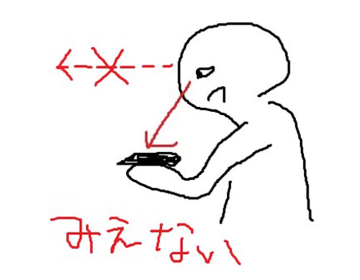 歩きスマホの何が問題かって、ずっと下を向いてることだと思うんですよ。なので、スマホを顔の前くらいまで上げれば、必然的に周りが見えると思うんですよね。