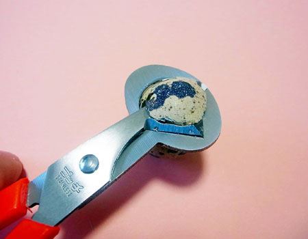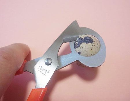 これは「うずら卵割り器」といって、うずらの卵をきれいにカットするための専用グッズだとか。世の中、いろいろな商品があるものですね。各社から類似の商品が販売されているようですが、筆者が購入したのは株式会社北正の「プッチ」という商品。株式会社北正は刃物で有名な岐阜県関市にあり、「プッチ」のパッケージには地域ブランドである「関の刃物」のロゴマーク付きということで、切れ味に期待できそう。それでは実際に使ってみましょう。