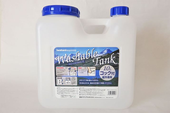 岩谷マテリアルの「ウォッシャブルタンク Nタイプ 10L レバー式コック付」です。素材はポリエチレンで、半透明なので外側からも水の量が判別できます
