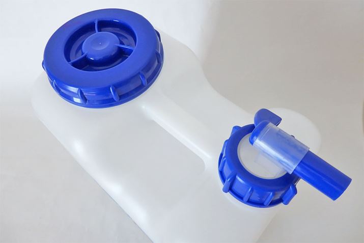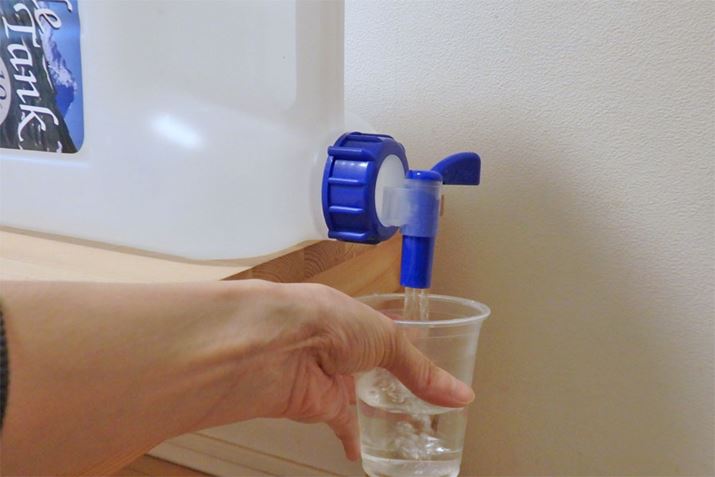 本体を横置きした状態でコック栓から給水してみました。漏れることなく、スムーズに水が排出されます。飲用以外の保存水として冬場は月に1回程度、夏なら2週間程度を目安に中身を入れ替えるのがよさそうです