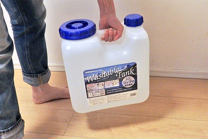 実際に満水の水を入れて持ってみたところ、10kg以上はあるので決して軽いわけではありませんが、十分持ち運ぶことができる重量でした。とはいえ、10Lでも軽々というわけにはいかないので、20Lなんて普通の女性にはとても持ち運べる重さではないことがよくわかりました。
