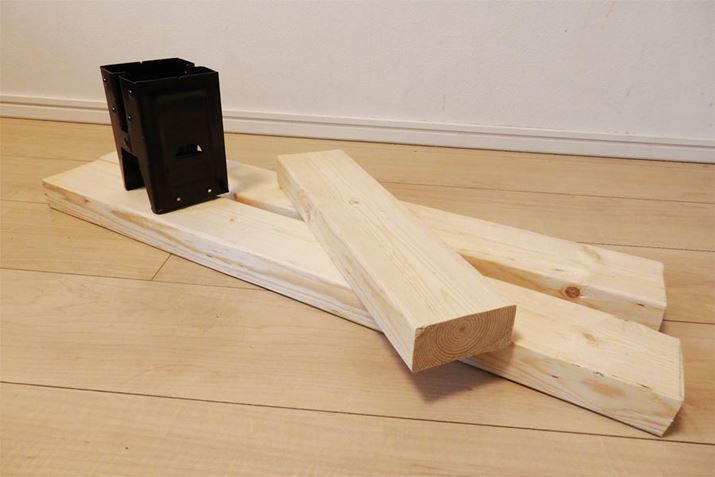 1組の“馬”を作るのに必要なのは、ブラケットのほかに脚となる2本の2×4材と、天板を載せる土台となる2×4材1本