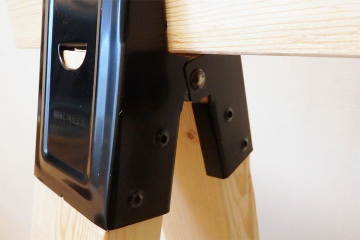 大型のクリップのようなこちらのアイテム。実はカットした2×4(ツーバイフォー)の角材をはめ込むことにより、“馬脚(ソーホース)”と呼ばれる作業台の脚を簡単につくることができるというものです。