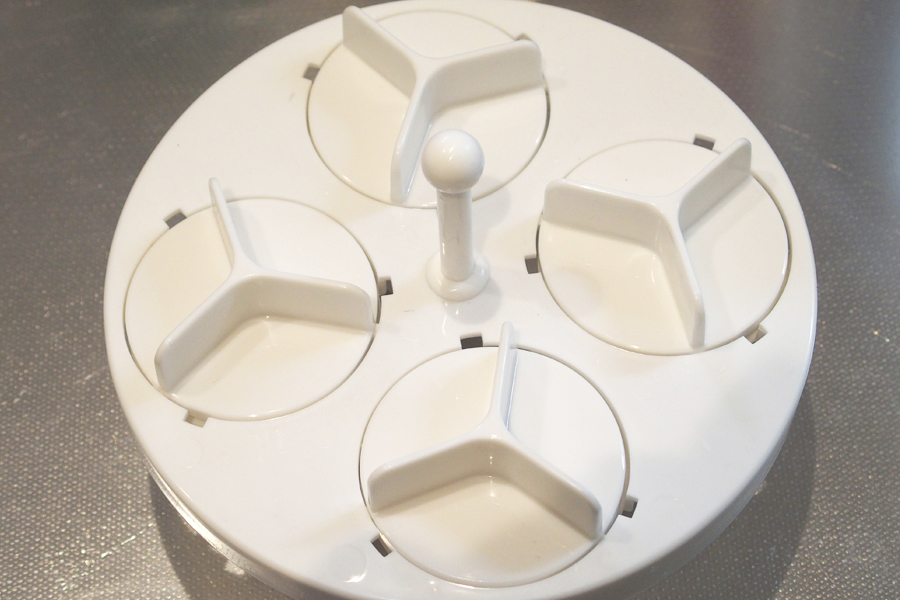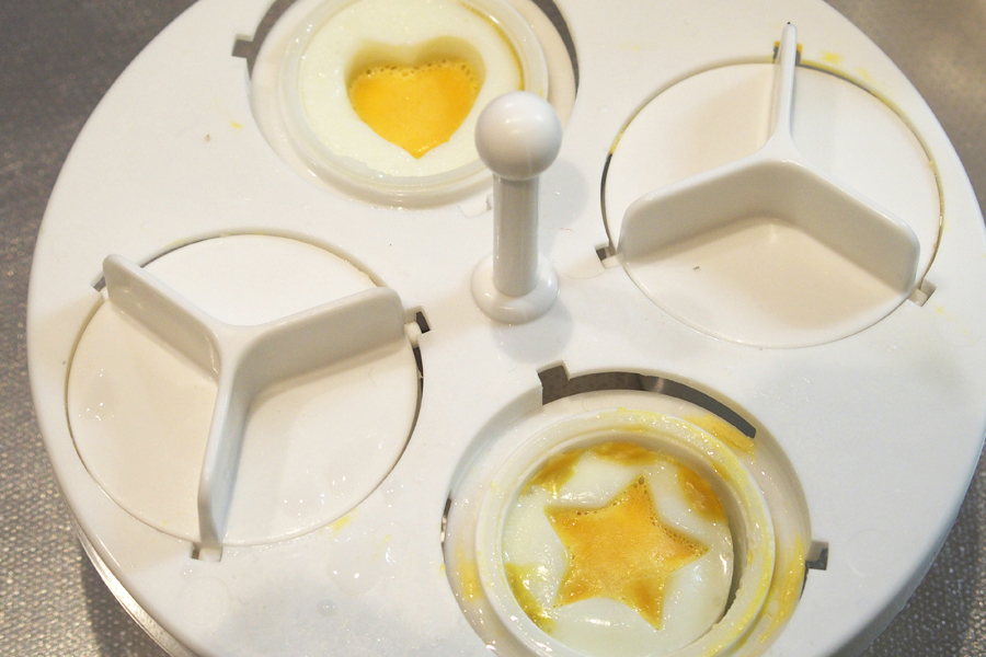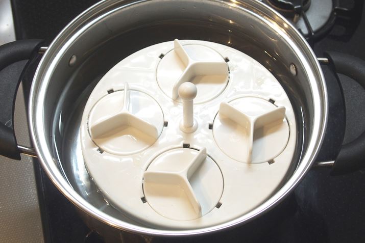 本体の蓋には、脱着式の型が付いています。この形の黄身のゆで卵ができます
