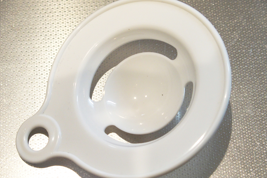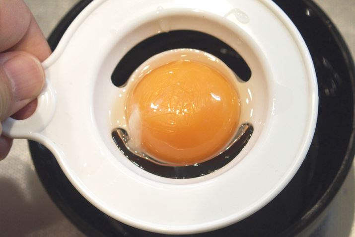 黄身と白身を分離します。黄身取り器の中央部分の皿に黄身を乗せると重みで白身が容器に落ちていきます。切れが悪いときは少し振ってみるといい感じです