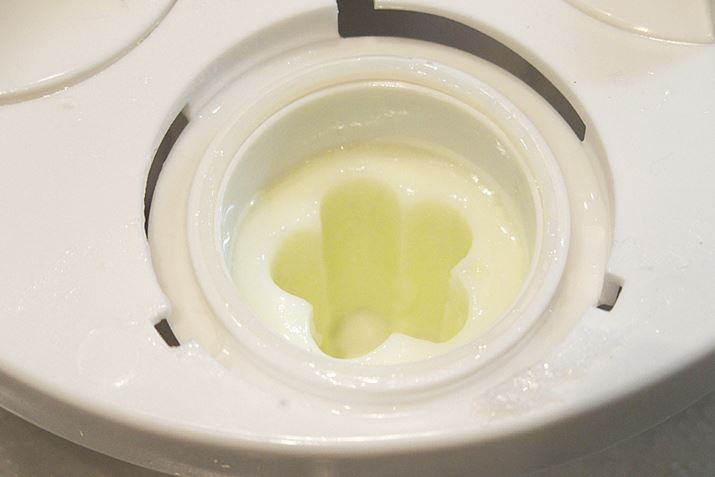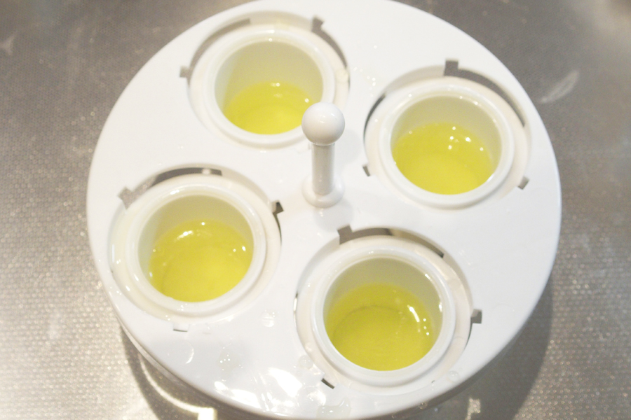 最初に白身と黄身を分離します。ドリームランドにはゆで卵を作る黄身取り器もついているのでこれを使用します。4つの容器とも使用して作るのであれば、卵は4〜5個使用します。卵はサイズによって使用個数が変わるので、1つずつ使って、容器に入れながら足りないようであれば、足していきましょう。