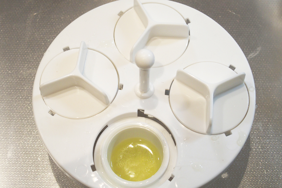 次に本体の容器と型付きの蓋に油を塗っておきます。油を塗っていないと、きれいに白身が剥がれないとのことなので、塗っておきましょう。