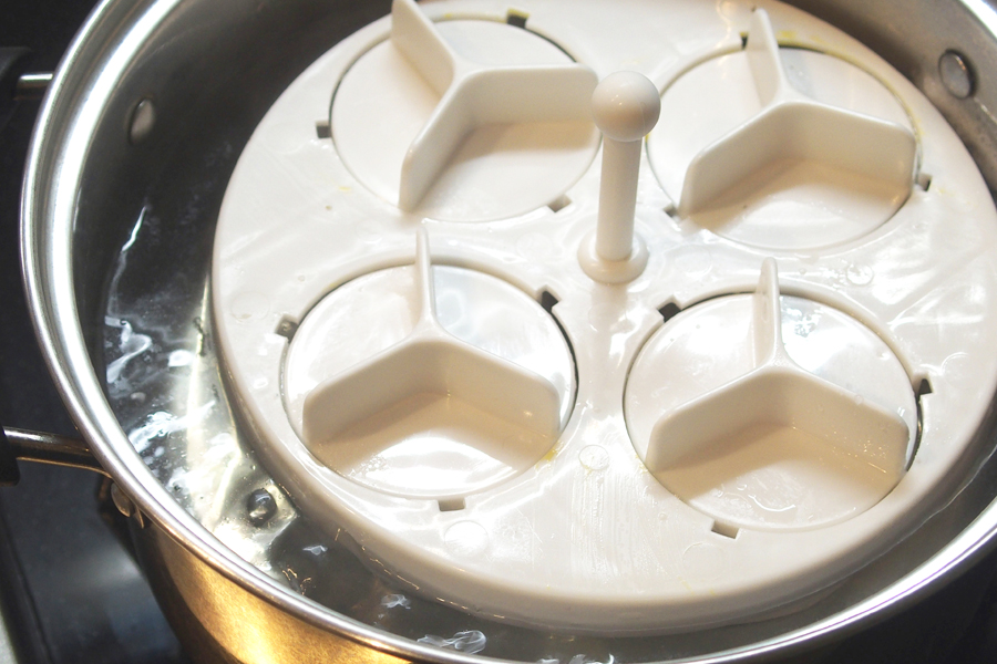 茹で終わったら、少し冷まして、ゆっくりと蓋を引き抜きます。油の塗りがあまいと、白身が型にくっついてしまうこともあります
