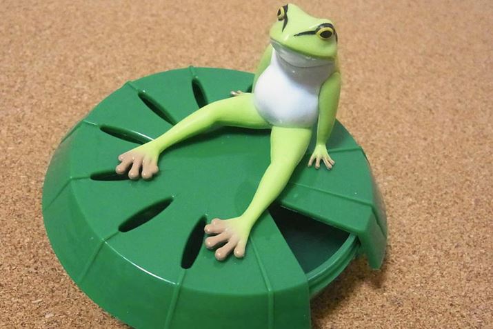 最初に葉っぱの形をしたフタを外します。次いで下容器のアルミフィルムをはがし、上のフタをもどして蛙田主任をセットすれば準備終了。主任も仕事モードに切り替わったようです♪