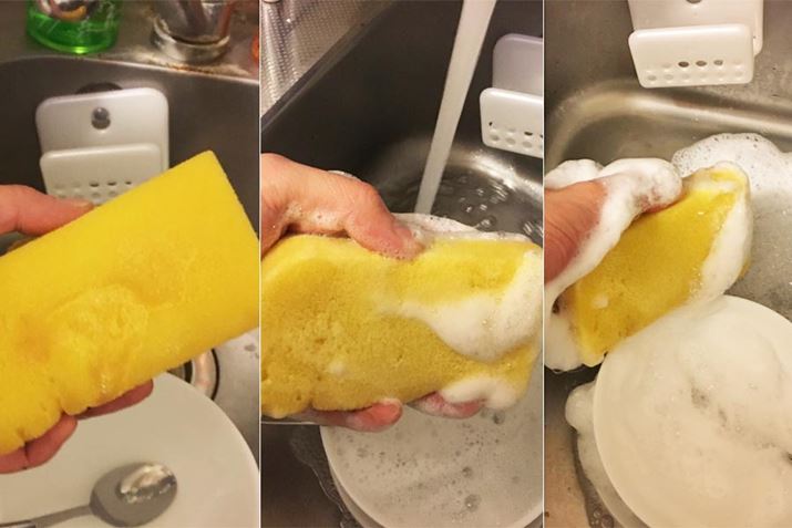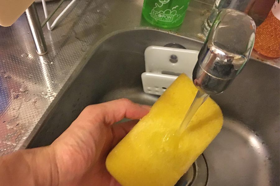 ボトルが上向きのままなことにくわえ、上部にお皿がありますので、洗剤の液ダレもしませんし、ボトルも汚れません(洗剤が出るお皿の部分は、プッシュ後多少ヌルヌルはします)。ちなみにスポンジがぬれていると、プッシュしたときにその水分がにじみ出てボトルに垂れて汚れますので、エコポンで洗剤を付けてからぬらしましょう。