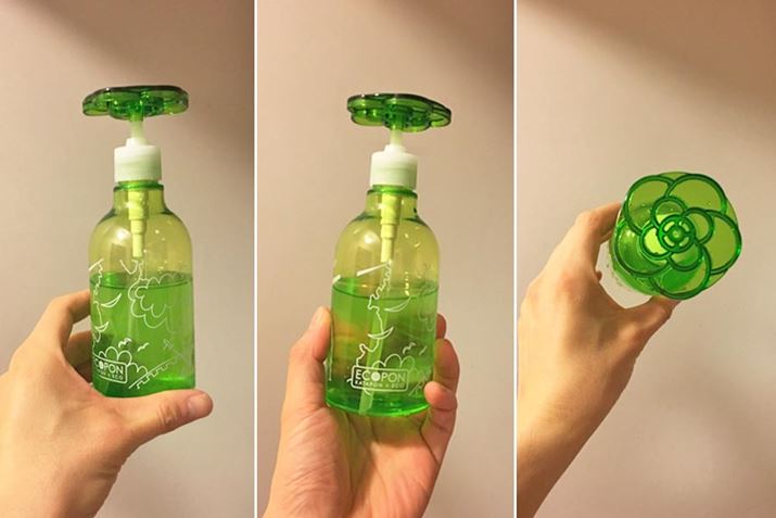 簡単にいうと、「ワンプッシュで適切な量が出る」ポンプ型の詰め替え容器です。食器用洗剤をメインに想定して作られているようで、「片手でワンプッシュ」をうたった『かたポン』という製品に、「eco」の観点をプラスした第2弾製品のようです。