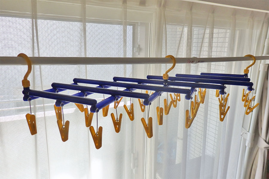 材質はポリプロピレン・ポリエチレン・スチールとあり、外側は樹脂製ですが、日本製でしっかりとした作りで安定感があります。3点式フックなので、洗濯物の重さのバランスを考えなくてもぐらつくことはありません。たかがピンチハンガーとはいえ、干す場所の自由度を高め、収納時もじゃまにならず、家事効率を改善してくれる、一石三鳥以上の秀逸品です。