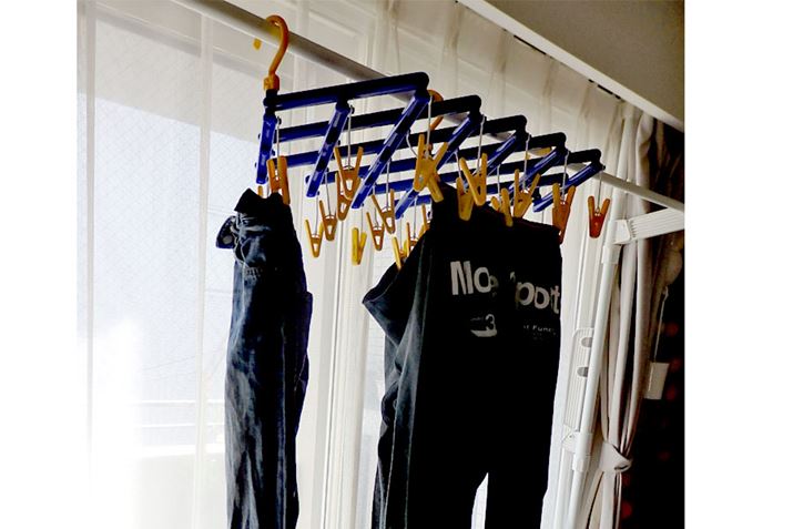 洗濯物を干す量やスペースに合わせて幅や奥行きを変えることができるという自由度の高さで、よくある長方形の角ハンガーが使いづらい壁際のような場所でも、これなら伸ばせば奥行きが縮まるので、効率よく設置することができるというわけです。また、外干しの際の突然の雨などで洗濯物を取り込む際にも、サッと縮めて楽に移動できるのも助かります。