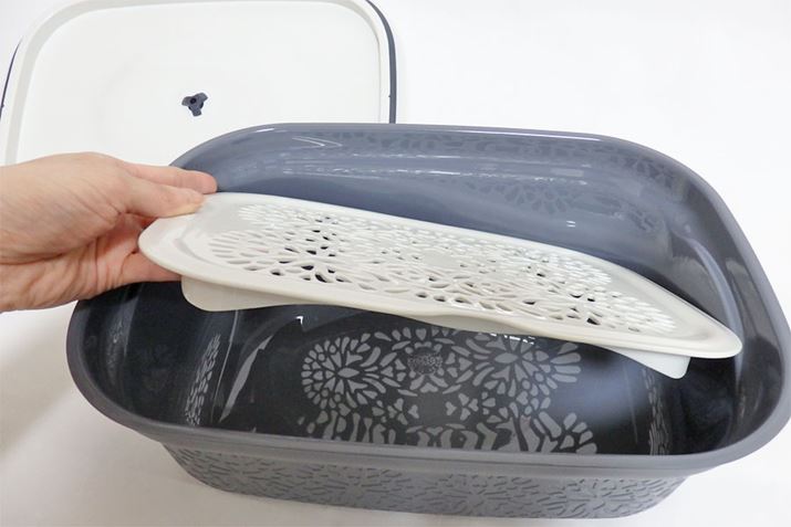 「水切りトレイ」をセット。中に入れたものを底面から離した状態で保存ができます。穴が開いているので水切り用にも