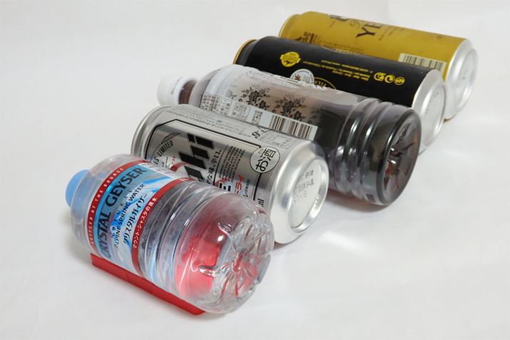 ホルダーを下に敷くことで転がらなくなり、このとおり常に缶やボトルが整然と並んでスッキリ!