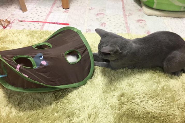 <動画付きで詳しく見たい方はこちら:猫じゃらしも電動の時代?翻弄される子猫がたまらんかわいい>ちょっと変わった見た目のこのおもちゃは、「マウス ハント」。猫の大好きなものがこれでもかと詰め込まれていて、延々とひとり遊びをしてくれるおもちゃです。カサカサ素材のテントのようなものの中にネズミや鈴入りボールが入っていて、猫ちゃんは穴から足を入れて遊ぶ…と言語化すると微妙に聞こえるのですが、猫ちゃんは本当に飽きずに楽しそうでした。