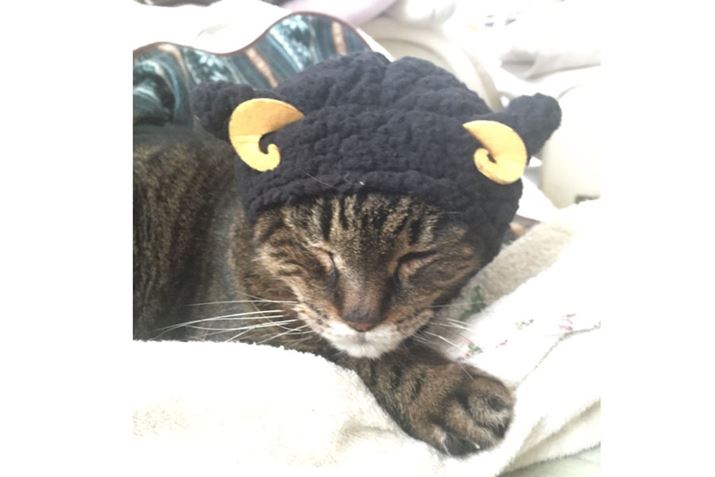 <全開にした様子はこちらで確認できます:きゅっと絞れば猫スッポリ。キャベツ型ベッドにメロメロですにゃ>もう写真を見ればおわかりですね? これは猫ちゃんにお召しいただくかぶりモノです。奇譚クラブがガチャポンとして出している「かわいい かわいい ねこひつじちゃん」というアイテム。今回買った「親ひつじ(黒)」のほかに、同じ形の白、ピンク、ブルーのカラーバリエーションと、ツノがないバージョンの「子ひつじ」のしろ、ブルーがラインアップしています。ただでさえかわいい猫がこんなことになって…SNSに写真を投稿すれば「いいね!」の嵐になること請け合いです。