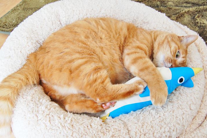 <ほかの猫ちゃんがかぶっている様子はこちら:にゃんこがひつじに変身しちゃうかぶりモノがかわいすぎる〜!>たわむれている様子があまりにもかわいいとSNS上で話題になっているのが、この「けりぐるみ」(猫ちゃんが抱えているペンギンです)。けりぐるみとはまたたび入りのクッションのことで、キックしやすい細長の形がポイント。両腕でぎゅっと抱きしめてキックするのにちょうどいい大きさになっていて、狩猟本能をくすぐるんだとか。この猫ちゃんも蹴りまくっていました! ペンギン以外にもサメやエビなどの種類があり、どれも非常にかわいらしいのでぜひ猫ちゃんに似合うものを選んであげてください。
