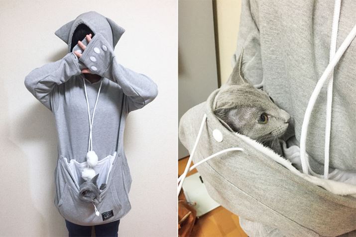 <ほかのカットはこちら:またたび入りのおもちゃでお猫様がメロメロ&スリムに!?>みなさま、ついに夢のアイテムが誕生です。この「にゃんガルーパーカー」があれば、大好きな猫ちゃんとずっと一緒に生活できちゃいます! カンガルーのようにお腹部分にポケットが付いているのがポイントで、こちらに、カンガルーの赤ちゃんよろしく猫ちゃんを入れるわけです。座っているときも、立ち上がって移動するときも、もう猫ちゃんをどかす必要はありません。これでずっと一緒です。これからの季節にぴったりのノースリーブタイプもありますよ♪