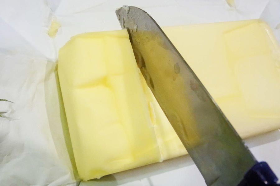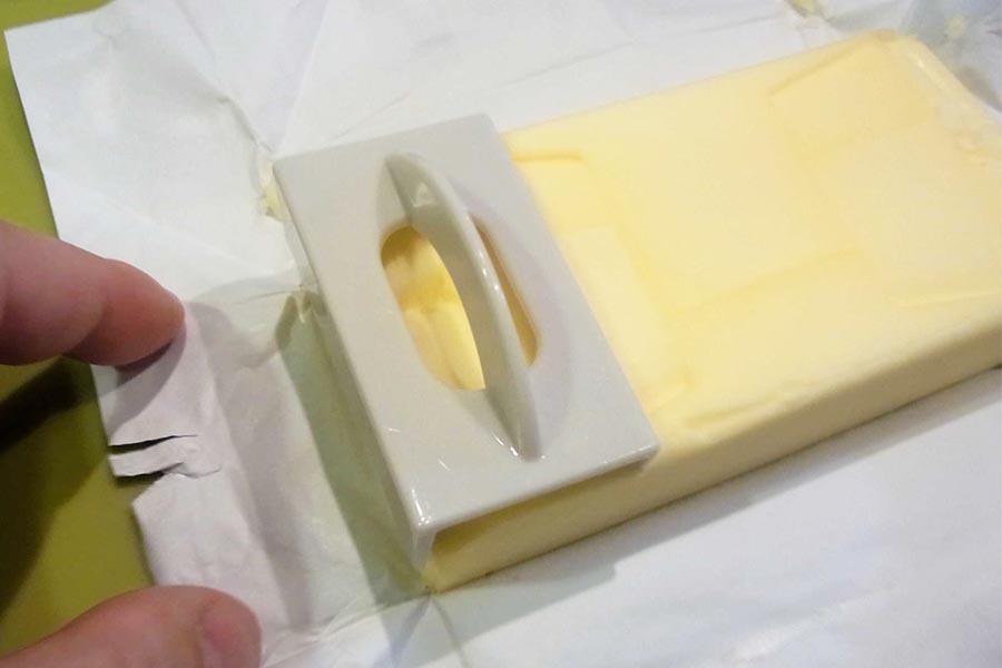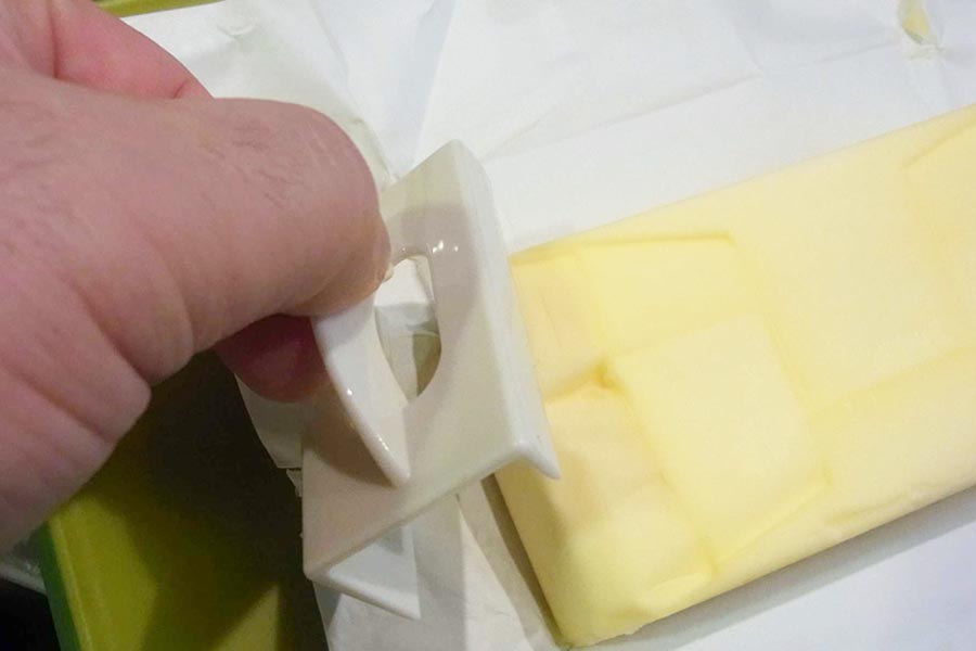 バターカットガイドを使ってバターの表面にカット位置の印をつけます。後は、印にしたがってバターをカット