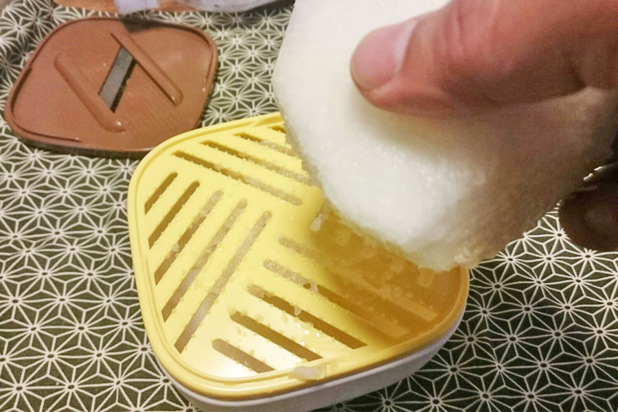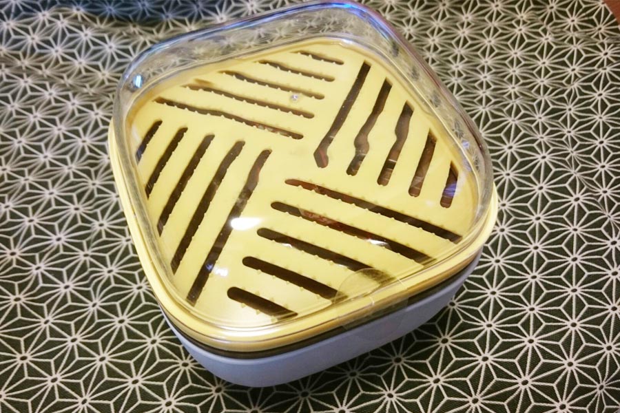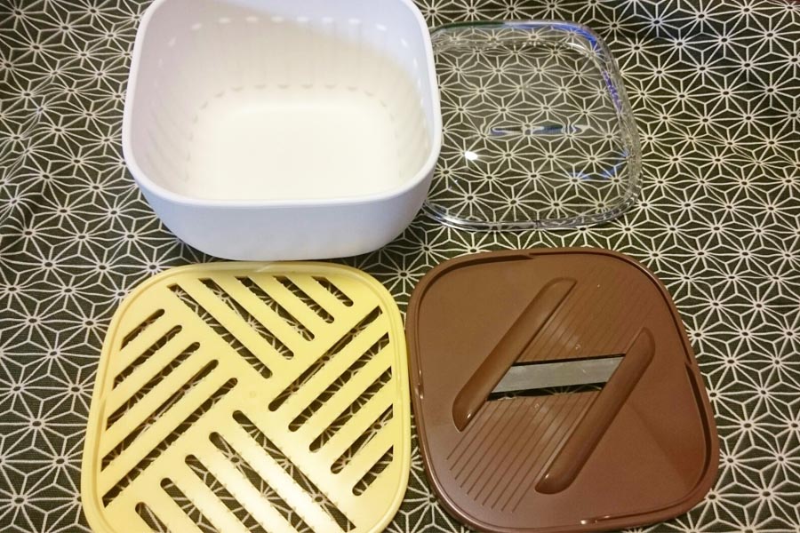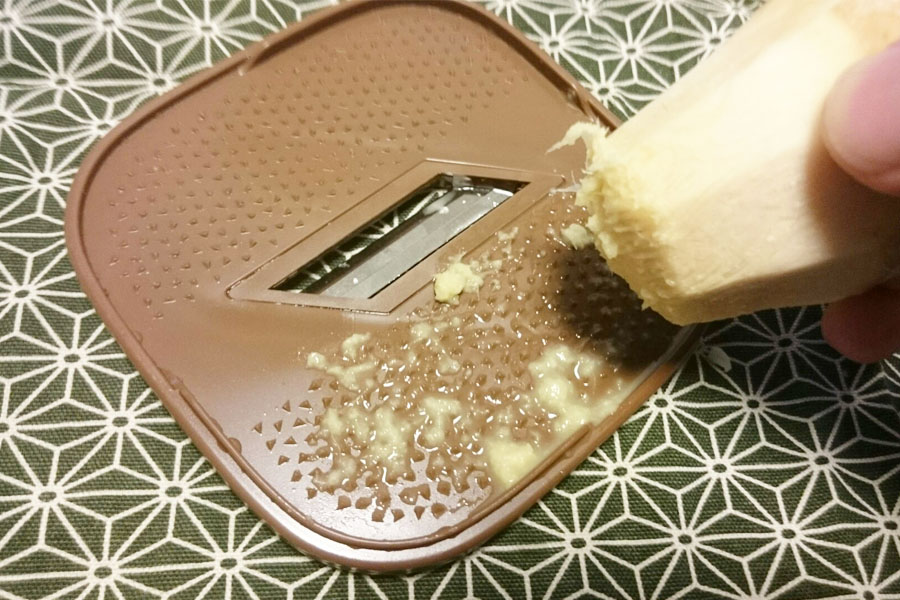スライサーは裏返せば薬味おろしになる。生姜とかをおろして、そのまま納豆にインできるぞ♪