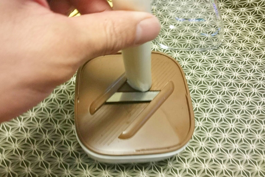 納豆にネギ入れたら最高だよね♪ でもわざわざ包丁とまな板を出してネギを刻むのは面倒…。しかーし! このセットなら小鉢にピッタリサイズのスライサーが付いているから、ネギを刻みつつ直接納豆にかけられるんだ。